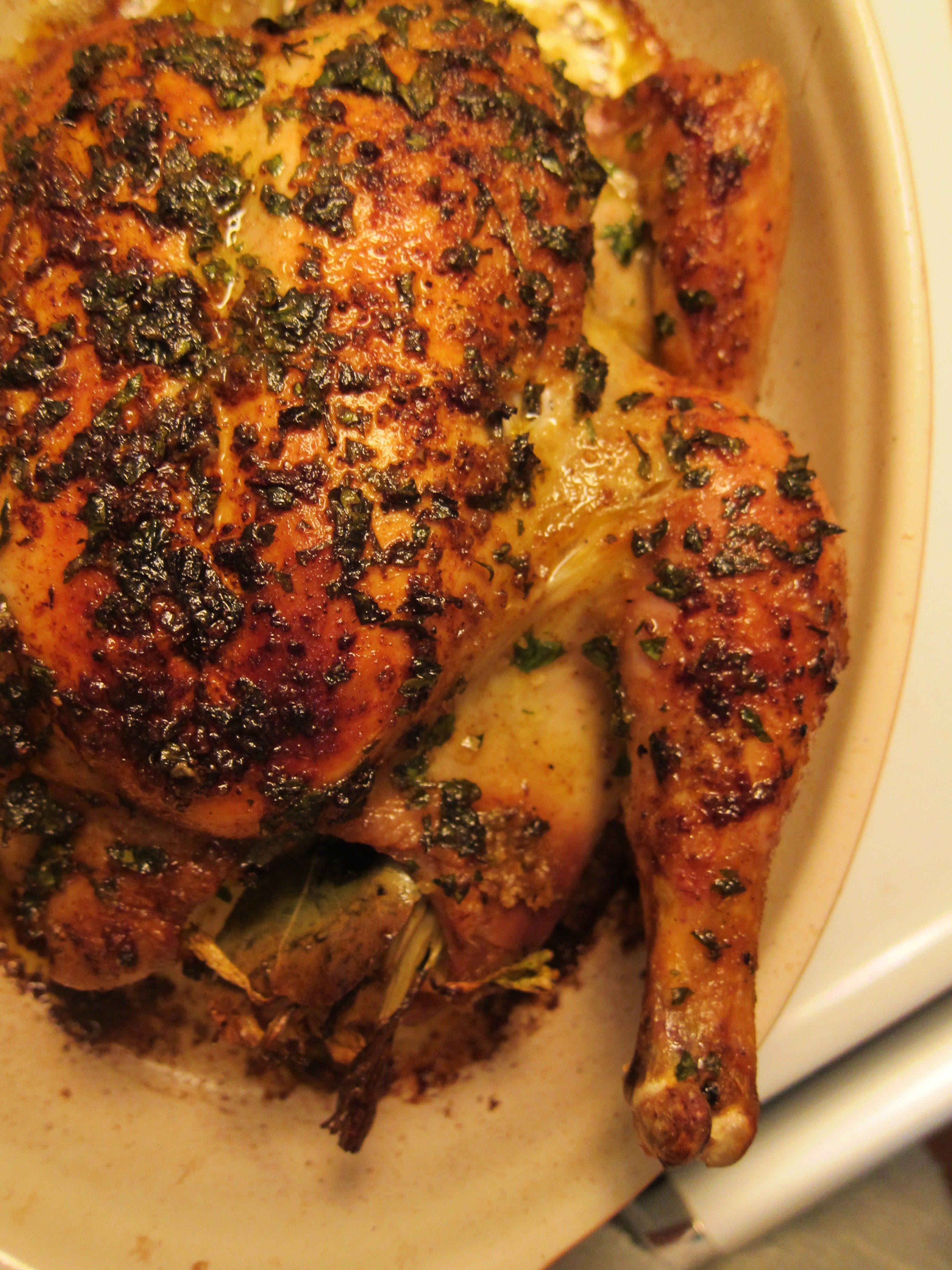 Rinse the chicken under cold water and pat dry. Insert garlic, lemon and sprigs of thyme and rosemary in the cavity of the bird. If you have kitchen twine, tie the legs together to prevent the lot from falling out and to keep the leg meat moist. Give the bird a little massage of butter. Sprinkle the chopped herbs all over the bird, and add a generous amount of salt and freshly ground pepper. Let chicken sit out, covered, until it reaches room temperature (about 40 minutes).