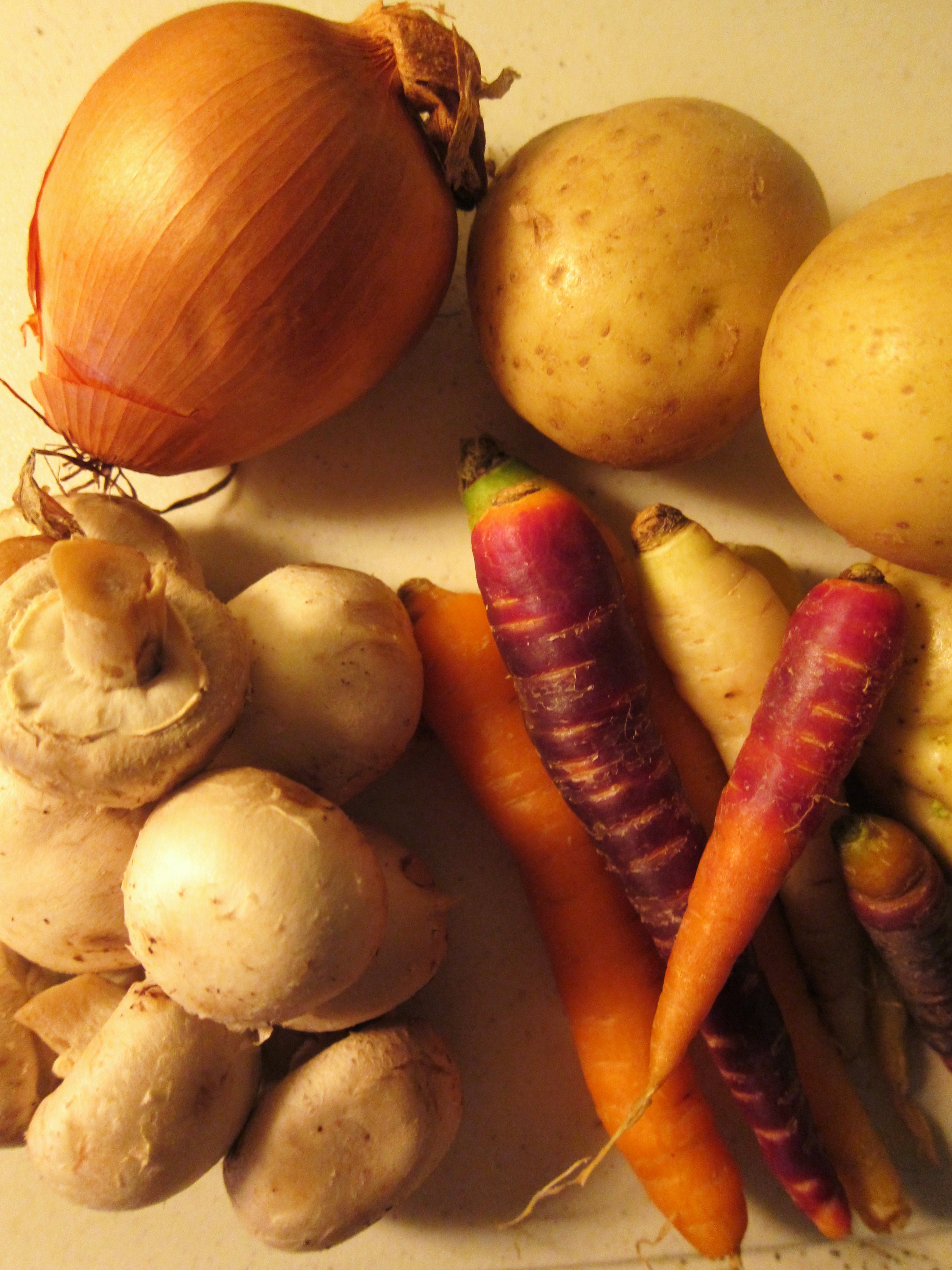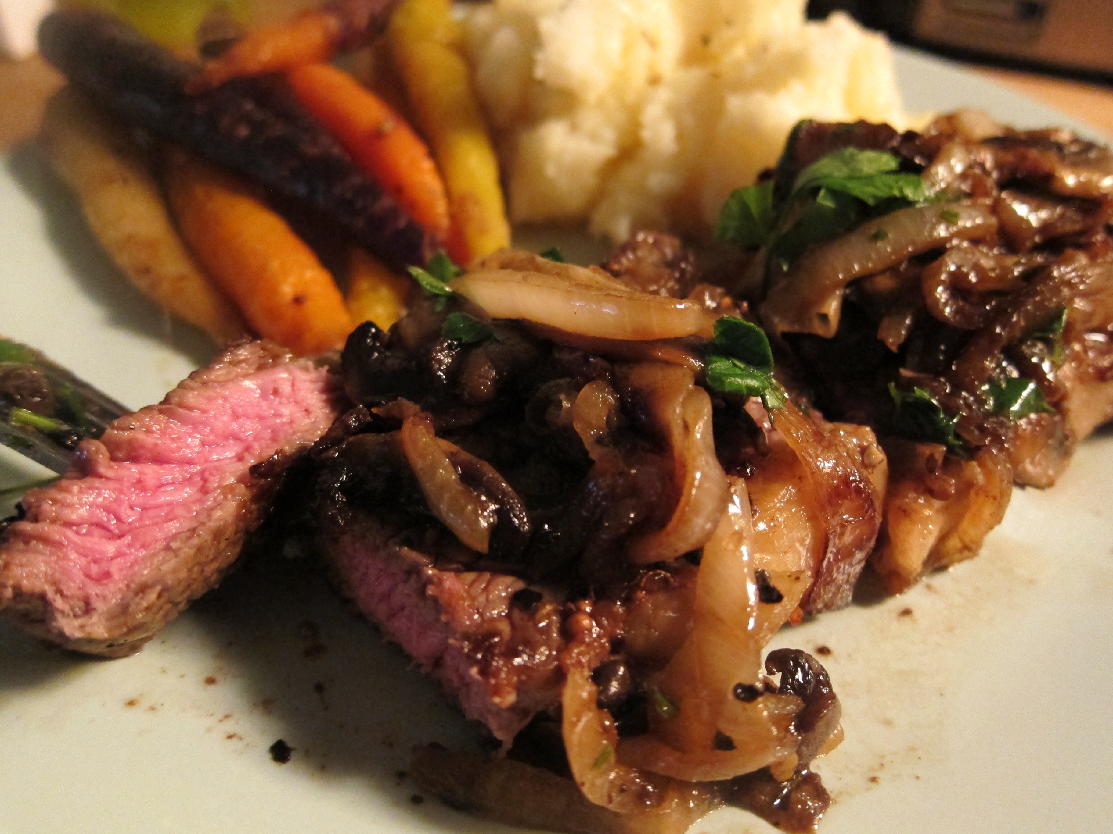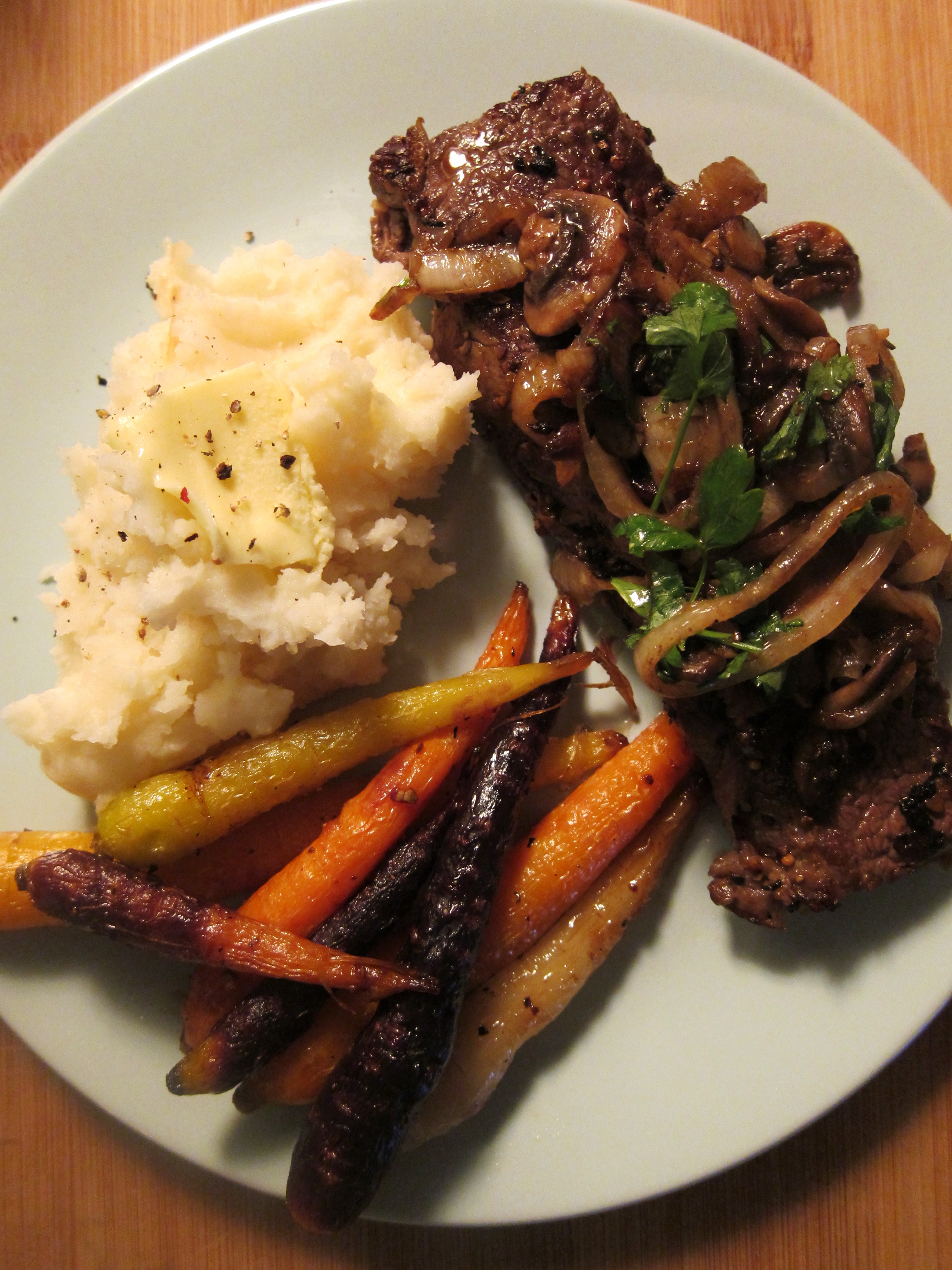 Note: start with setting the oven to 400°F for the carrots and prepping and boiling the potatoes before doing anything else. Carrots and potatoes should be almost done when you’re ready to start cooking the mushrooms and, at the very end, the steak.