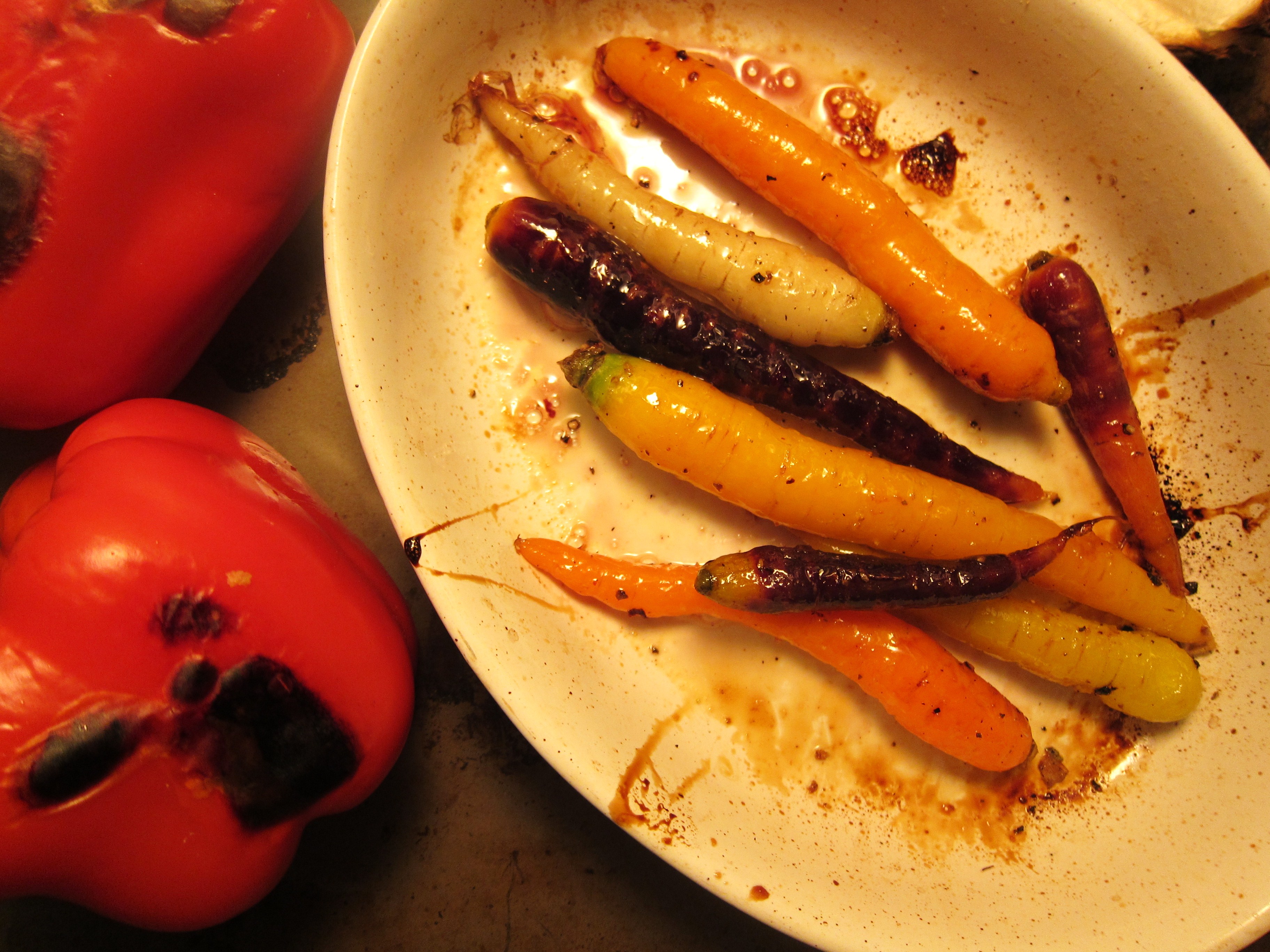 Set the oven to 400°F. Place whole carrots in a roasting dish with the oil, honey, salt and pepper. Put in the oven and roast for about 10-15 minutes, depending on the size of your carrots. Toss the carrots once, halfway through the cooking time. (Note: Stick a half-head of garlic in the oven when you start roasted the carrots – you will use this for the potatoes.)