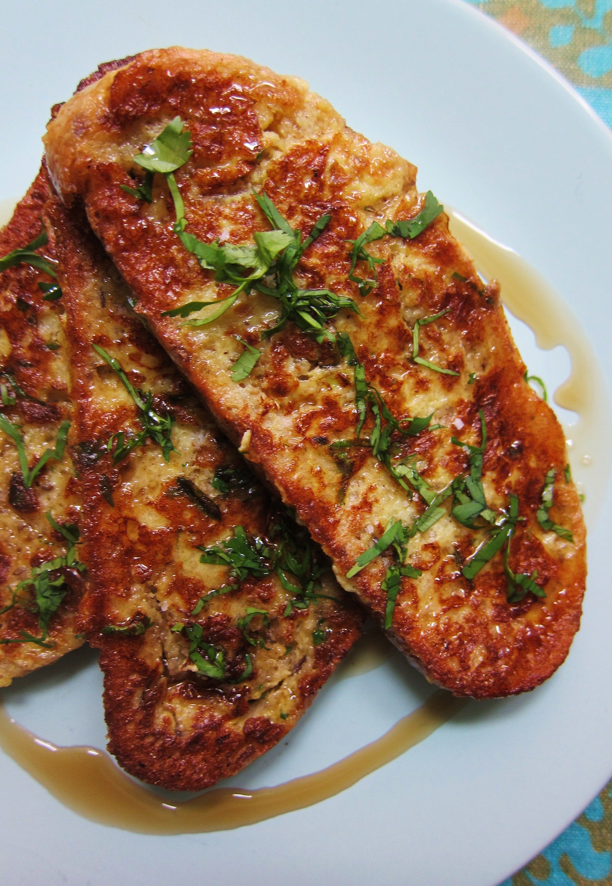 Dip the bread into the egg batter, drain off any excess, and place straight into the hot pan. Fry for 2 to 3 minutes on each side, until golden-brown and crispy. Serve warm with a drizzle of maple syrup or something tangy/spicy like sriracha sauce.