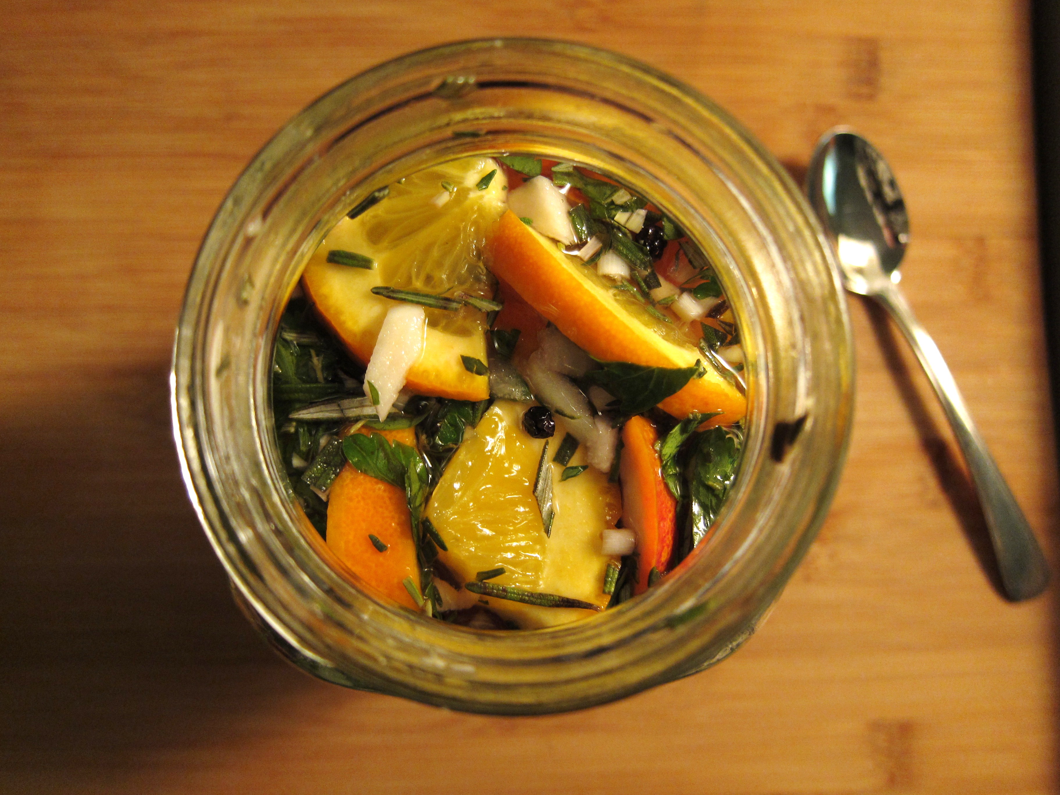 Place all of the vegetables, fruits, herbs, and spices in a clean 1-quart jar. Fill the jar with vinegar, covering all the ingredients and making sure there are no air bubbles. Cap the jar. If using a metal lid, place a piece of parchment or wax paper between the jar and the lid to prevent corrosion from the vinegar. Shake well.