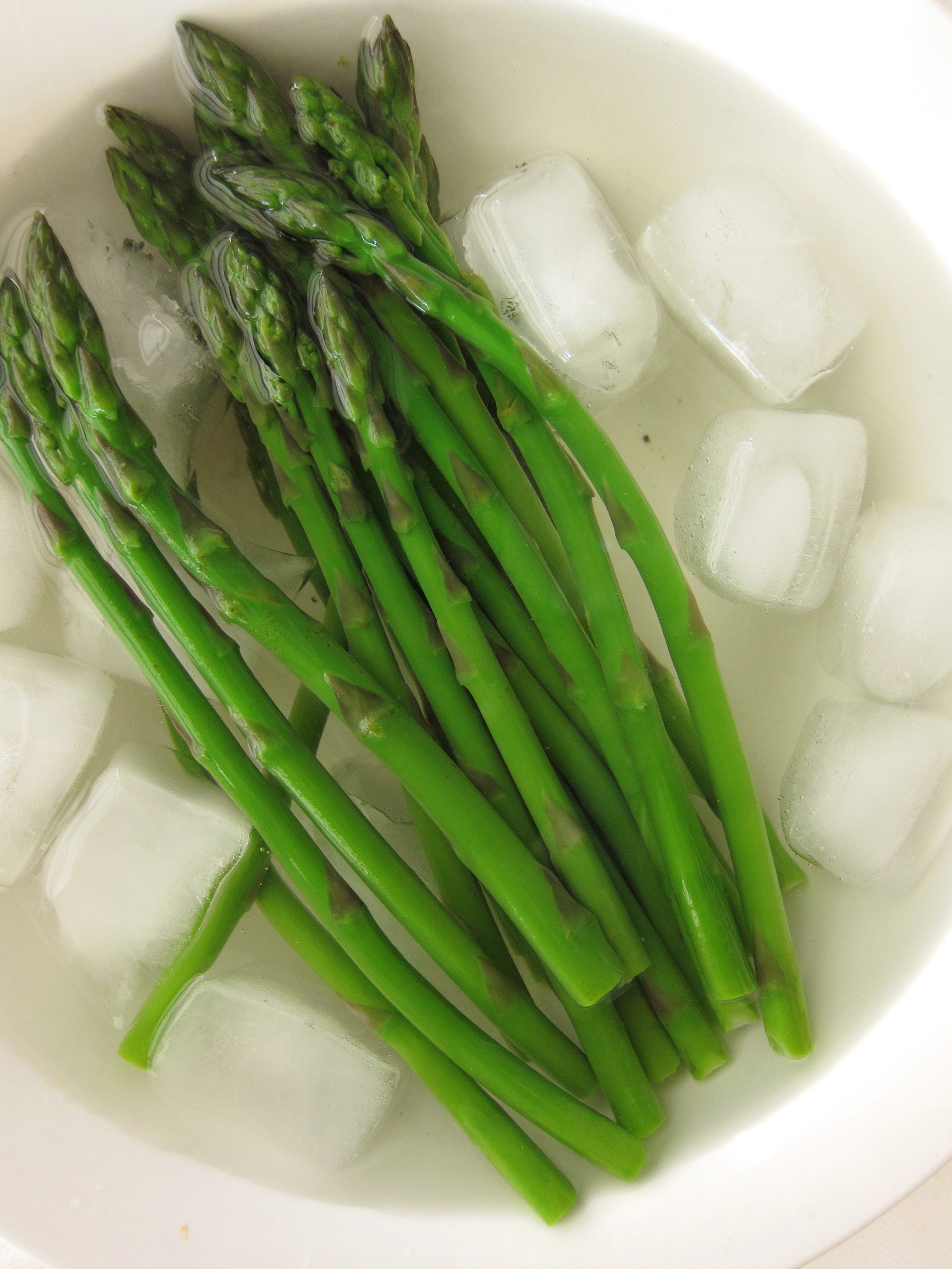 To prep the asparagus: prepare an ice bath – fill a medium-sized bowl with cold water and several ice cubes. Set aside. Fill a pan with a bit of water (about an inch). Bring to a boil and toss in the asparagus. Allow to blanch for about 1 minute, remove the asparagus from the water and place them to cool in the ice bath.