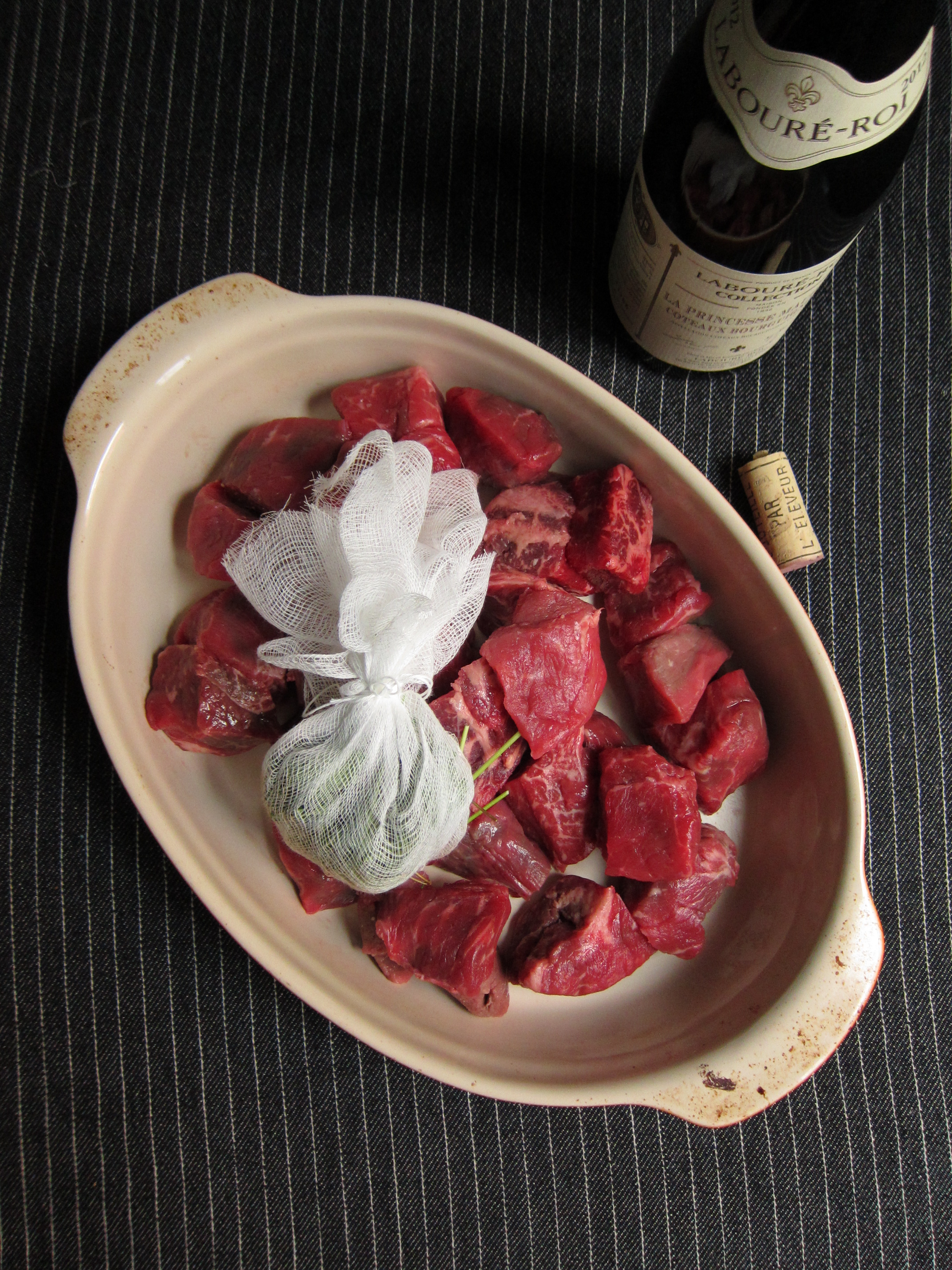 1) Place peppercorns, bay leaf, parsley, and thyme on a piece of cheesecloth; tie into a tight package and transfer to a large bowl. Add beef and wine; cover and chill overnight.
