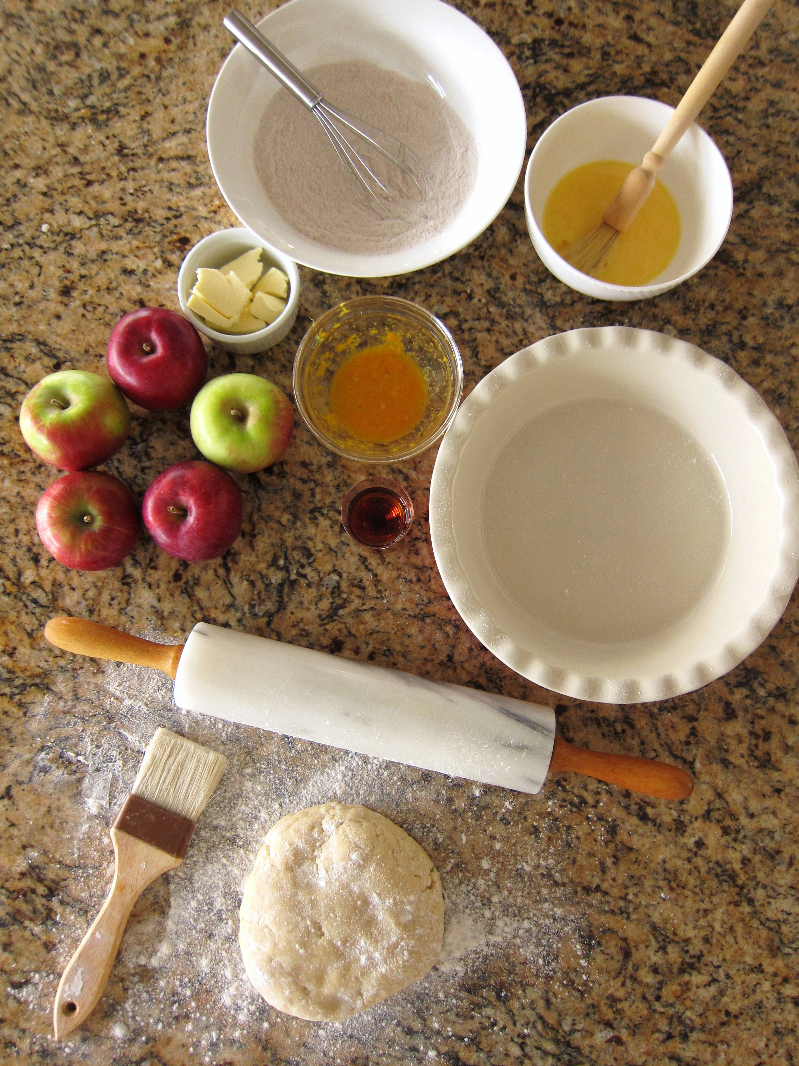 4) Put the pie on a baking sheet to catch any drips and bake for 15 minutes on the lowest rack of your oven, then lower the oven temp to 350º and bake for 40-50 minutes or until the crust is deep golden brown and the apple juices bubble.