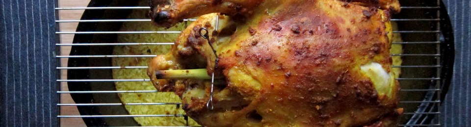 5) Now, place a baking-rack over the baking-dish, and set the chicken on top, breast-side down first (this gives the thighs a head start and prevents the breasts from overcooking). Place the whole thing in the middle-rack of the oven and roast for 15 min, then gently turn the chicken over so the breast-side now faces up, and roast for another 30-35 min until the chicken is browned. Remove the baking-rack with the chicken on top, and let rest for 10 min. Leave the rice in the oven during this time so it can finish cooking.